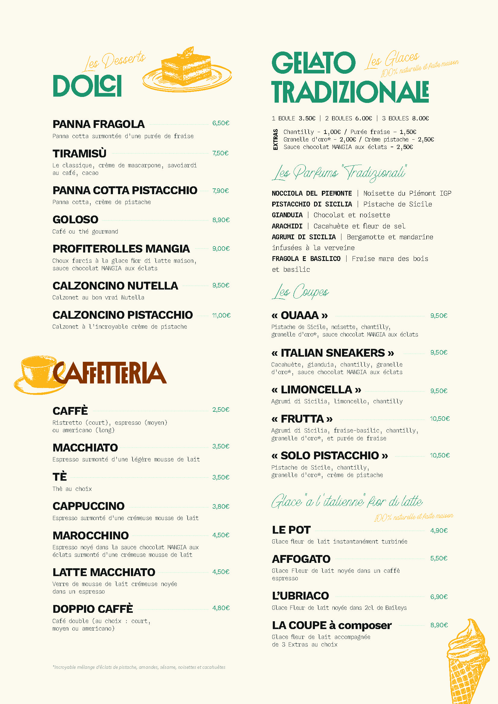 Terminez votre repas en beauté avec nos dolci et glaces italiennes, des desserts italiens exquis qui raviront vos papilles, accompagnés d’un café espresso aromatique pour une fin parfaite à votre repas.